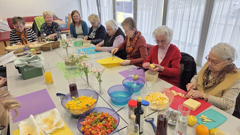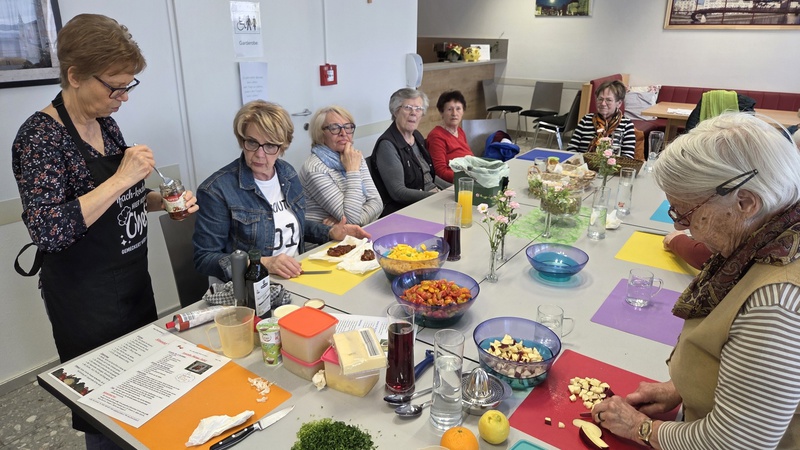 Mit wenig Aufwand und großer Begeisterung werden Aufstriche, Salat und Nachspeise in gemütlicher Runde gemeinsam zubereitet.